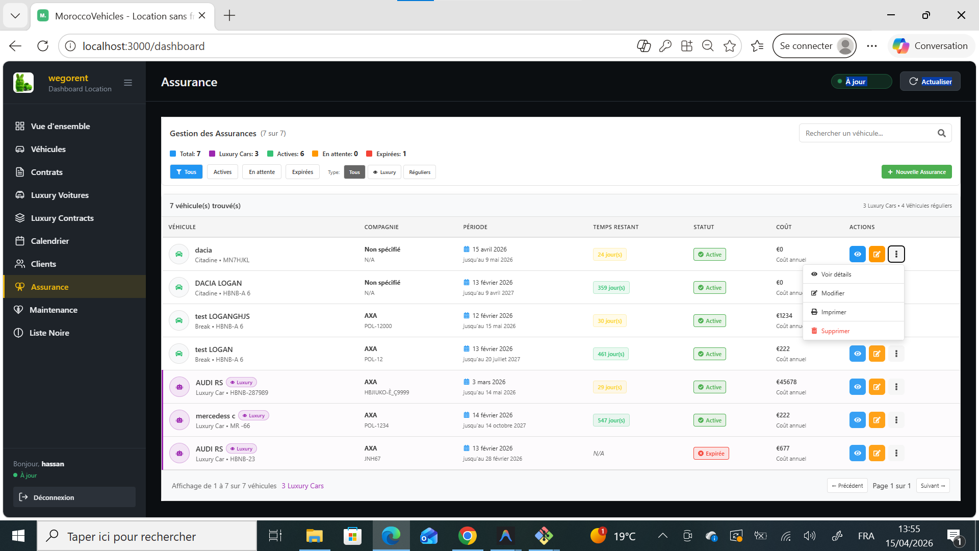 Oui, la gestion centralisée vous permet d'assigner les garanties d'assurance (Tous risques, Tierce, etc.) spécifiques à chaque location. Les cautions et franchises se calculent ensuite dynamiquement lors de la création d'un contrat.