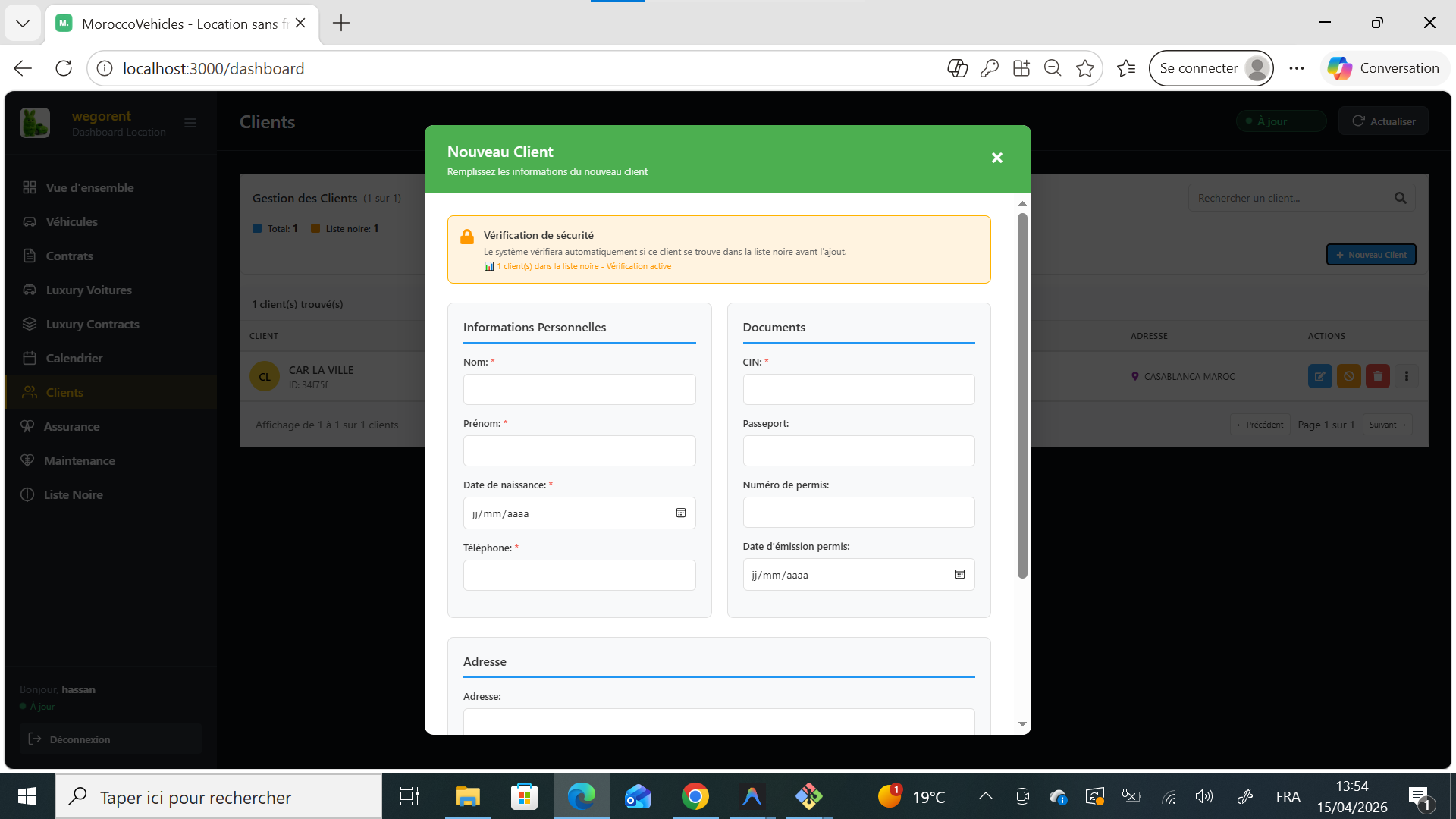 Chaque fiche client dispose d'un coffre-fort numérique sécurisé. Vous pouvez y joindre les scans de permis de conduire, passeports et CIN. Le système vous alerte automatiquement si un document obligatoire (comme le permis) arrive à expiration ou s'il est manquant avant de valider un contrat.